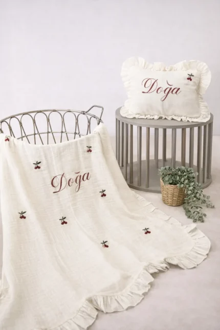 Müslin Set – Yastık ve Battaniye (Kiraz Detaylı)