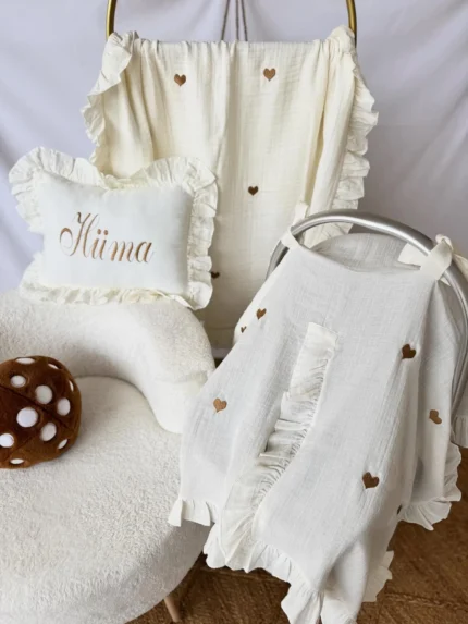 Müslin Set – Yastık, Battaniye ve Puset Örtüsü (Minik Kalp Detaylı)