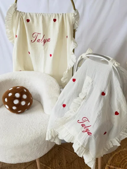 Müslin 2’li Set – Puset Örtüsü ve Battaniye (Kalp Detaylı)