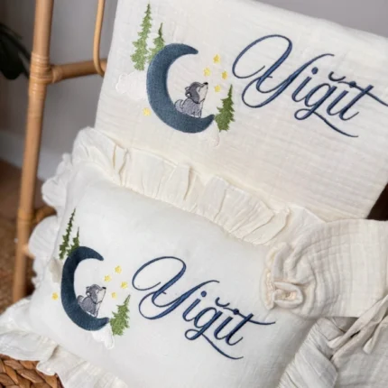 Müslin Set – Yastık, Battaniye ve Tulum(Kurt ve Ay Detaylı)