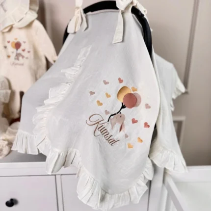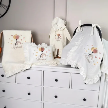 Müslin Set – Yastık, Battaniye, Puset Örtüsü ve Tulum(Tavşan ve Balon Detaylı)