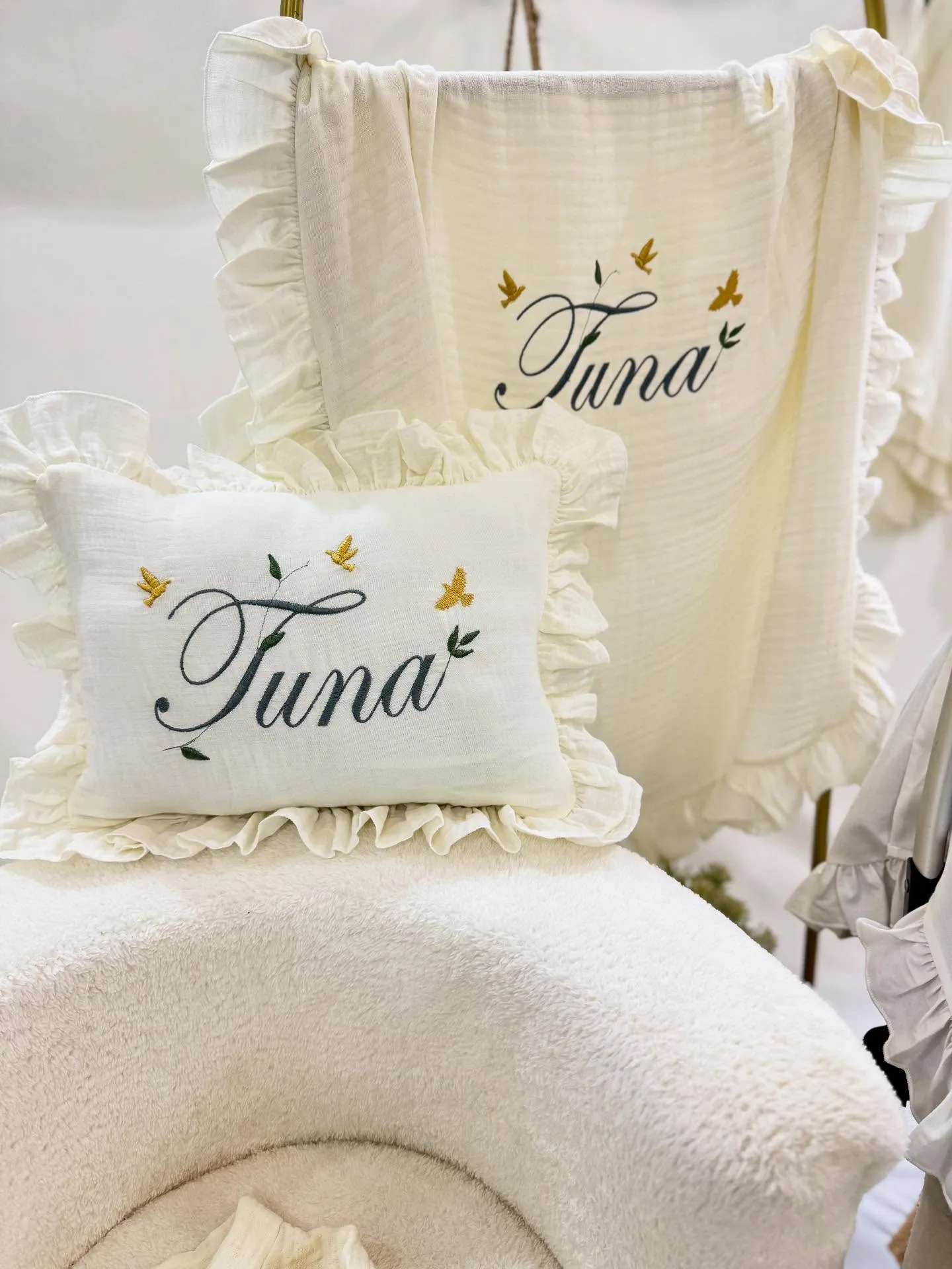 Müslin 2’li Set – Yastık ve Battaniye (Kuş Detaylı)