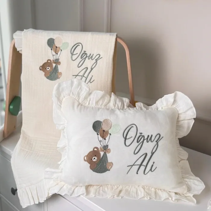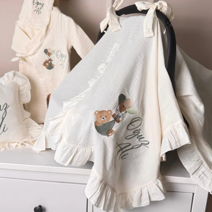 Müslin Set – Yastık, Battaniye, Puset Örtüsü ve Tulum(Ayıcık ve Balon Detaylı)
