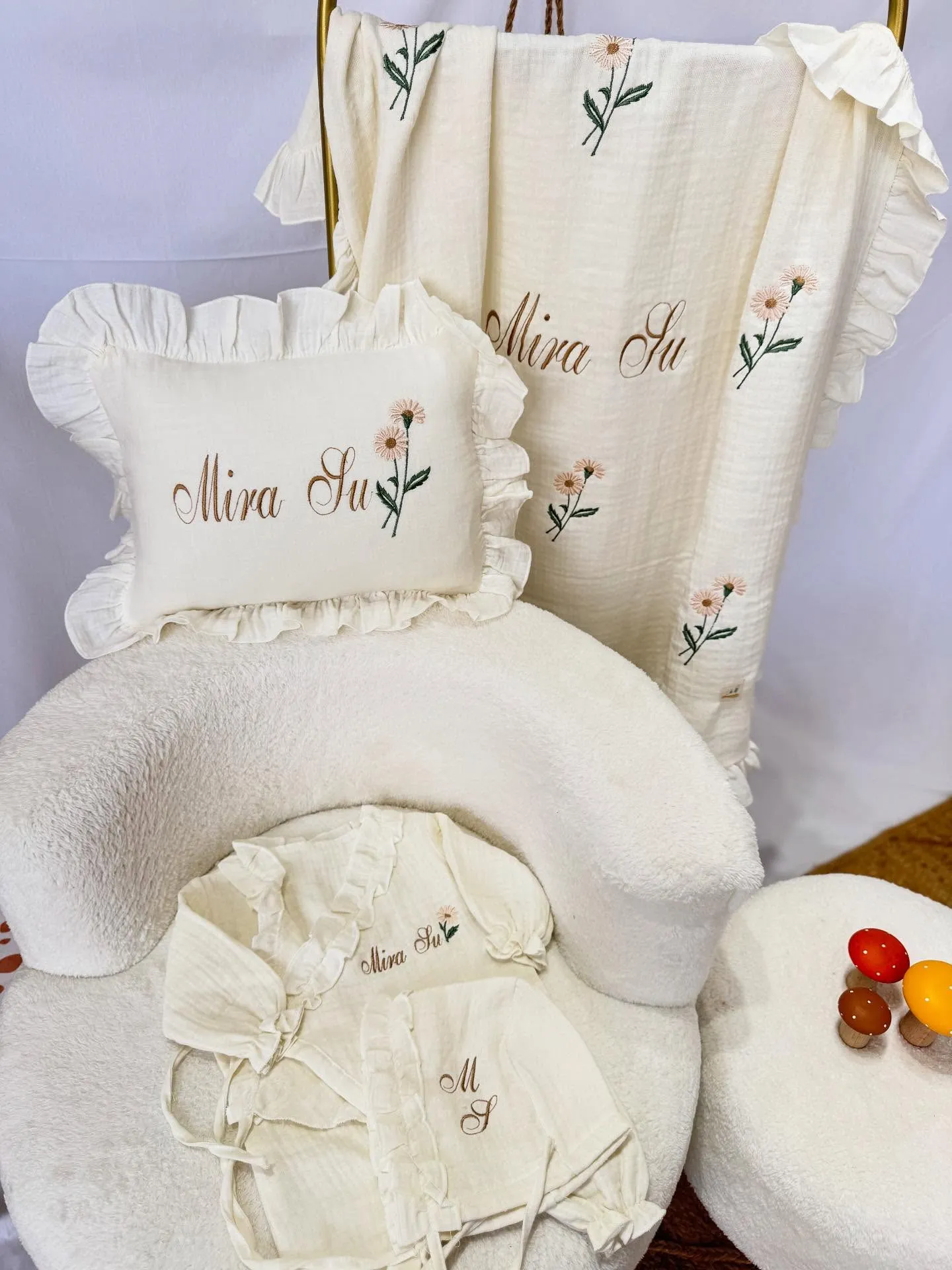 Müslin Set – Yastık, Battaniye ve Tulum (Çiçek Detaylı)